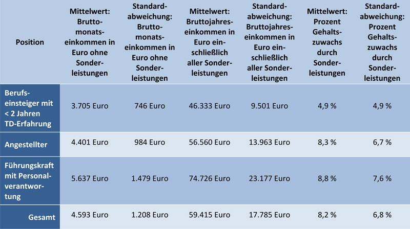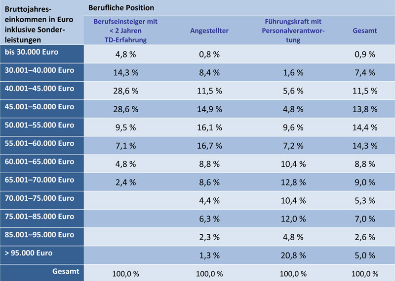 Die Gehälter in der Technischen Kommunikation liegen etwa auf dem Niveau eines Ingenieursgehalts: Berufseinsteiger erhalten im Durchschnitt 3.705 Euro im Monat, ohne Sonderleistungen. Das Jahresgehalt mit Sonderleistungen beträgt bei ihnen im Mittel 46.333 Euro, wobei die Sonderleistungen einen Anteil von 4,9 Prozent ausmachen. Angestellte verdienen durchschnittlich 4.401 Euro. Mit etwa 8,3 Prozent des Gehalts an zusätzlichen Sonderleistungen kommen sie auf ein Jahresgehalt von 56.560 Euro. Führungskräfte mit Personalverantwortung beziehen im Monat durchschnittlich 5.637 Euro und kommen inklusive der Sonderleistungen, die durchschnittlich 8,8 Prozent des Gesamtgehalts betragen, auf 74.726 Euro.