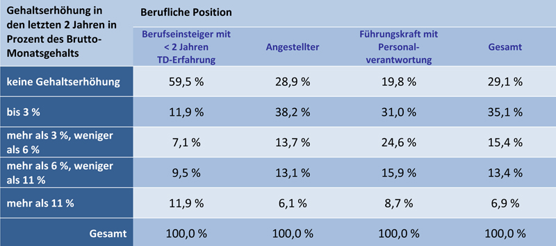 Ermittelt wurde die Entwicklung der Einkommen zudem anhand der Frage nach der Gehaltserhöhung in den letzten 2 Jahren in Prozent des Bruttomonatsgehalts. Über alle beruflichen Positionen hinweg, haben 70 Prozent der Befragten in den letzten 2 Jahren eine Gehaltserhöhung erhalten.