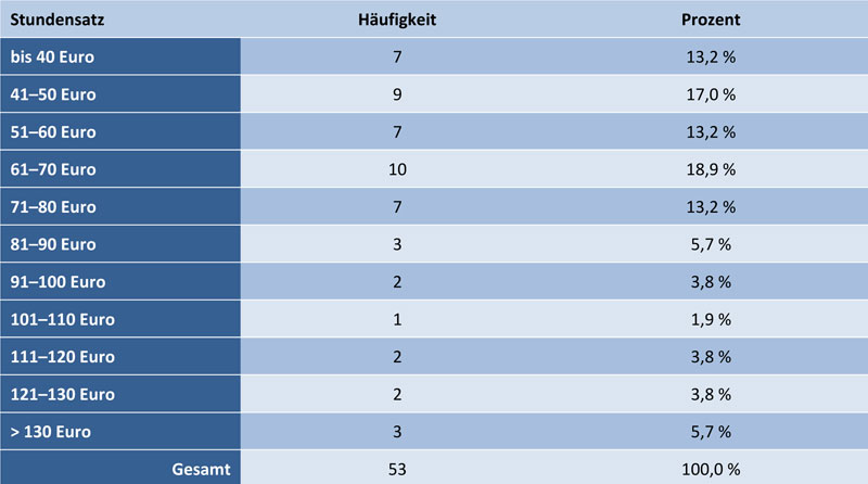 In der Technischen Kommunikation sind zudem viele freiberuflich tätig bzw. selbstständig. Ihre Einkommen sind nicht vergleichbar mit denen von Angestellten. Selbstständige müssen viele Kosten selbst tragen, wie Sozialversicherung, aber auch Bürokosten und Rücklagen für Ausfälle. Die Datenanalyse der Angaben von 53 freiberuflich Tätigen / Selbstständigen ergibt einen durchschnittlichen Stundensatz von 71 Euro. Das Minimum beträgt 3o Euro, das Maximum 150 Euro. Die Standardabweichung ist 30,42 Euro. Sie gibt an, dass 68 Prozent der Werte im Bereich 40 Euro bis 101 Euro liegen.